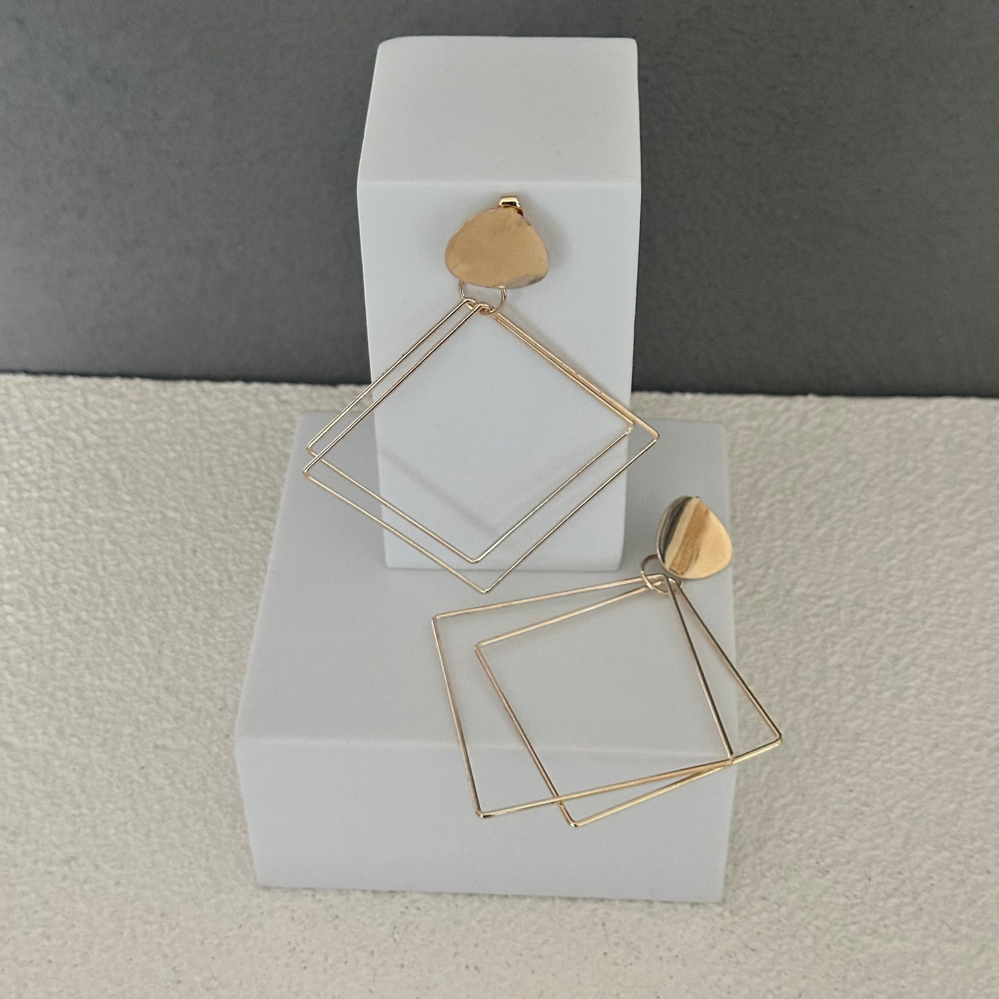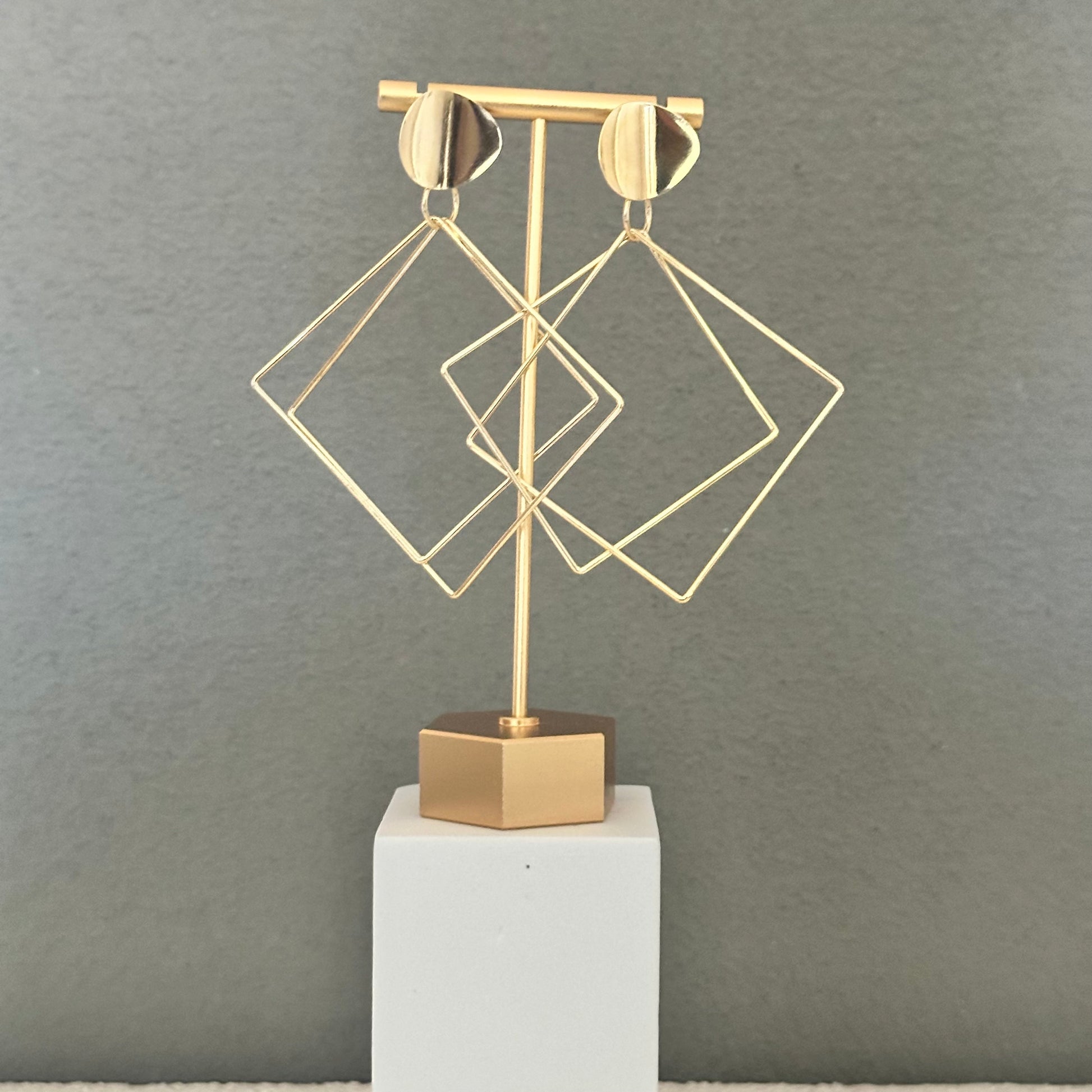 Featuring a sleek geometric design, these earrings dangle gracefully and are dipped in radiant gold for a luxurious finish. Perfect for both casual wear and elegant occasions, they add a modern edge and timeless sophistication to any outfit.