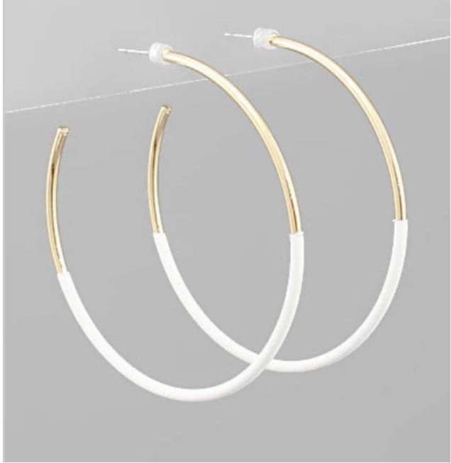 Elevate your accessory game with our White/ Gold Skinny Hoop Earrings | Skinny Hoop, featuring a sleek 2-inch diameter design that effortlessly combines modern elegance with everyday comfort. Crafted with a stunning white finish complemented by radiant gold accents, these earrings add a touch of sophistication to any look.
