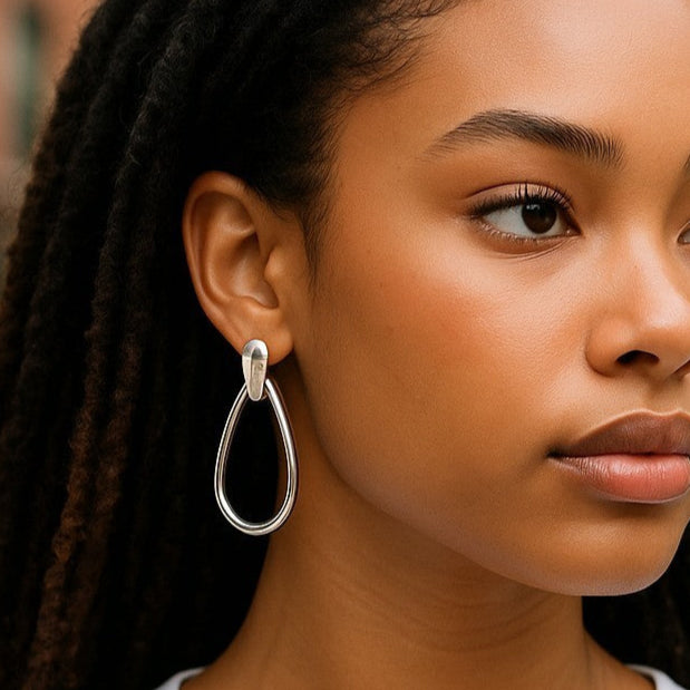 Crafted with high-quality silver, these earrings feature a unique teardrop-shaped design that beautifully resembles a classic doorknocker. Their eye-catching silhouette effortlessly draws attention while maintaining a refined look suitable for both casual and formal occasions.