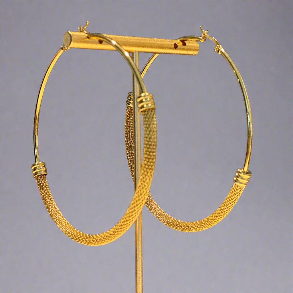 Turn heads with Golden Glam Mesh Hoop Earrings—large, bold hoops crafted from durable stainless steel with a luxurious golden finish. Featuring intricate mesh detailing and a lightweight design, these statement earrings are perfect for day-to-night wear.
