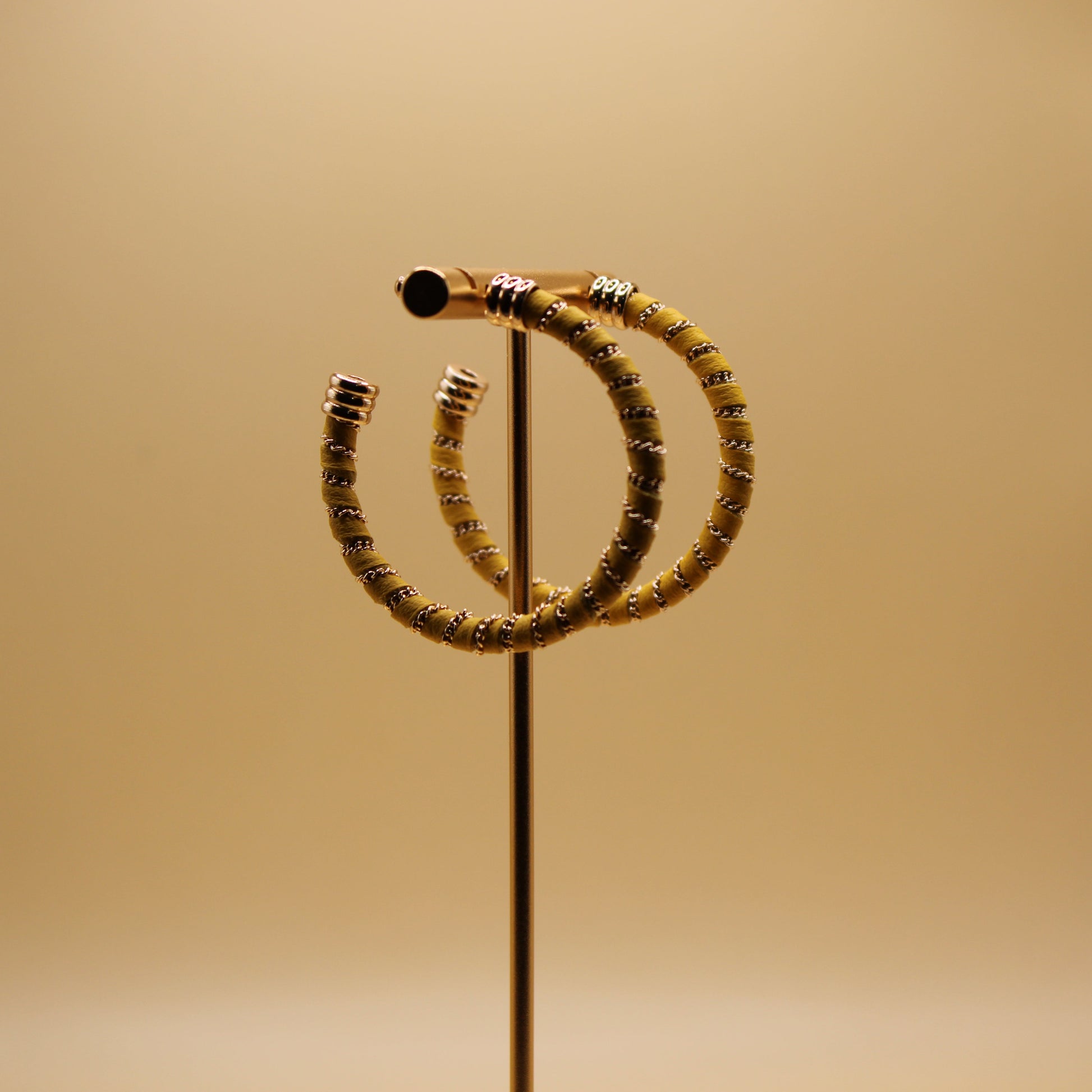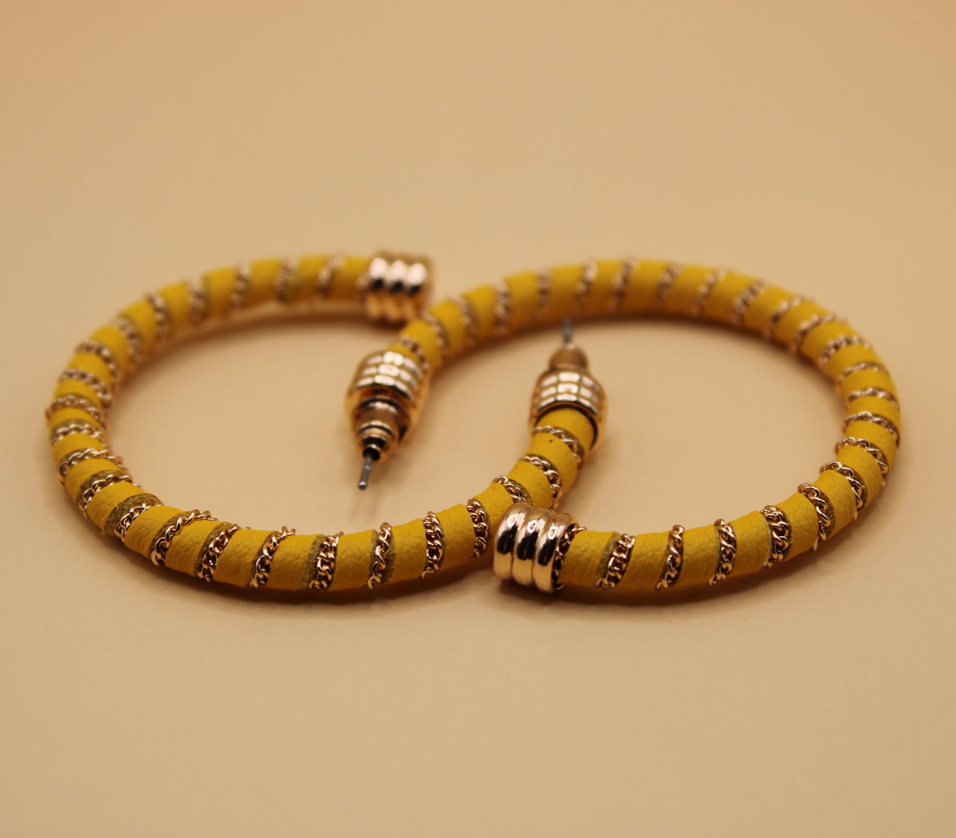 Elevate your accessory game with our Leather and Chain - Yellow earrings, designed to seamlessly blend modern style with timeless elegance. Featuring a sleek open hoop design, these earrings measure 40mm in diameter, striking the perfect balance between noticeable and understated.